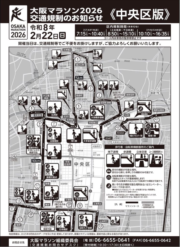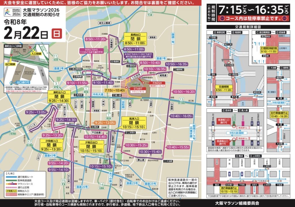投稿日: 2026年1月18日2026年1月18日2月22日(日)大阪マラソン2026 交通規制のお知らせ 2026年2月22日(日)大阪マラソン2026 が開催されます午前7時15分 ~ 午後4時35分ごろまで大阪市内の広範囲で交通規制が行われます。交通規制中は車両による通行・横断ができません自転車や歩行者もコースの横断が制限されます 当日お店にお越しのお客様は通行推奨ルート、主な通行可能ルートの確認をお願いいたします